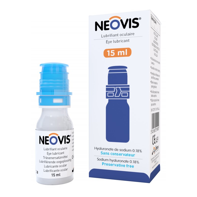 Neovis Colirio es un colirio oftálmico de alta calidad formulado con hialuronato de sodio, un componente natural presente en el ojo que ayuda a proteger la superficie ocular y mantenerla hidratada.