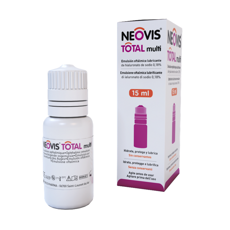Neovis Total Multi Emulsión Lubricante es un colirio oftálmico lubricante formulado con hialuronato de sodio, un componente naturalmente presente en el ojo que protege y mantiene la superficie ocular frente a la irritación. Gracias a su capacidad para retener agua, Neovis Total Multi Emulsión Lubricante crea una película protectora y lubricante sobre la córnea y la conjuntiva, proporcionando alivio prolongado en casos de sequedad ocular.