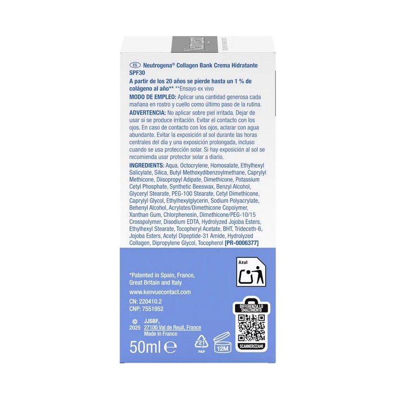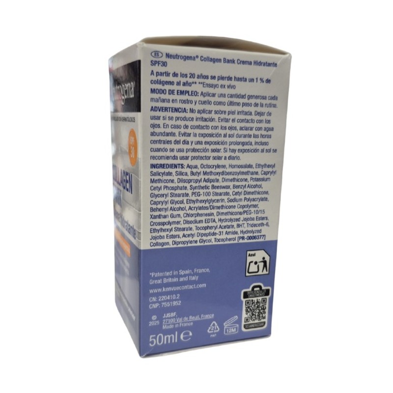 Neutrogena Collagen Bank Crema Hidratante SPF 30 es un tratamiento facial avanzado diseñado para ayudar a preservar el colágeno natural de la piel y mantener un aspecto más firme, liso y joven. Gracias a su exclusiva tecnología de micropéptidos patentada con colágeno, esta crema actúa desde las capas más profundas de la epidermis, favoreciendo la producción natural de colágeno y aportando una hidratación intensa y duradera.