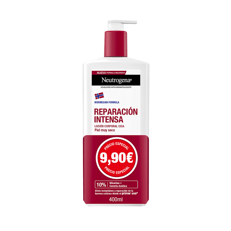 Neutrogena Reparación Intensa Loción CICA es una loción corporal de alta eficacia desarrollada junto a dermatólogos, formulada especialmente para piel muy seca, irritada o sensible. Inspirada en la Fórmula Noruega, combina un 10 % de glicerina con Centella Asiática, un potente ingrediente natural con propiedades regeneradoras y antioxidantes, para ofrecer una hidratación profunda, reparación visible y alivio inmediato.