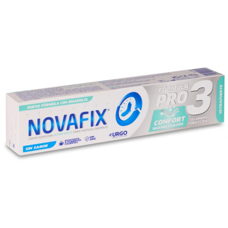 NOVAFIX Fórmula PRO 3 Confort es una crema adhesiva ultrafuerte para prótesis dentales desarrollada para ofrecer una fijación segura, duradera y cómoda durante todo el día. Gracias a su avanzada fórmula con Bisabolol y polímero de vinilo, esta crema proporciona una sujeción superior sin alterar el sabor de los alimentos, ya que es sin sabor y sin zinc.