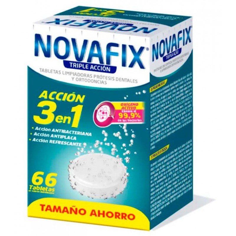 La fórmula de Novafix Tabletas Limpiadoras Triple Acción está basada en Oxígeno Activo y agentes limpiadores suaves que eliminan eficazmente las bacterias y restos orgánicos sin dañar la prótesis. Además, contiene componentes desodorizantes que neutralizan los malos olores, dejando un agradable sabor y sensación de frescor.