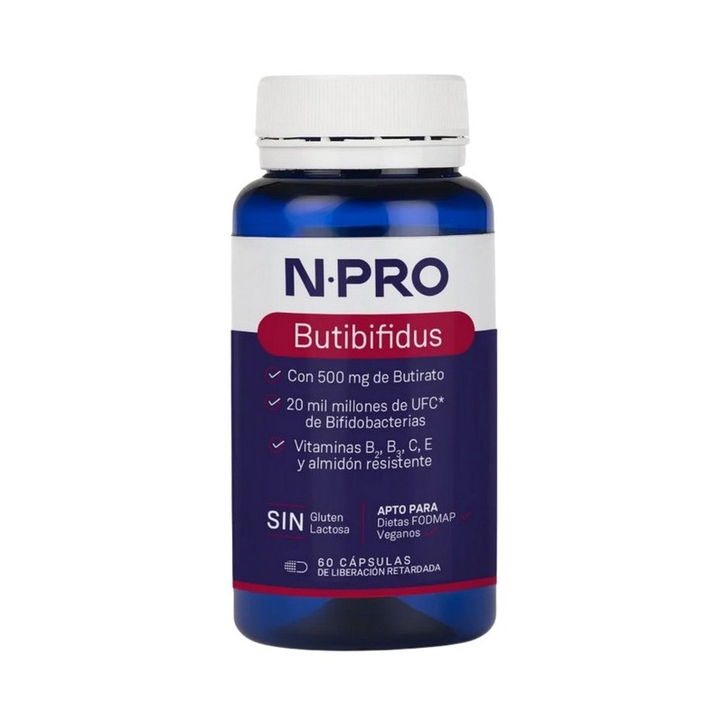 NPRO Butibifidus Cápsulas es un complemento alimenticio innovador formulado con 500 mg de butirato y una mezcla equilibrada de 6 cepas de Bifidobacterias cuidadosamente seleccionadas. Además, su fórmula se enriquece con vitaminas B2, B3, C y E, así como almidón resistente tipo II, lo que potencia su acción a nivel intestinal. Su objetivo principal es favorecer el equilibrio de la microbiota intestinal, mejorar la función digestiva y mantener la salud del colon.
