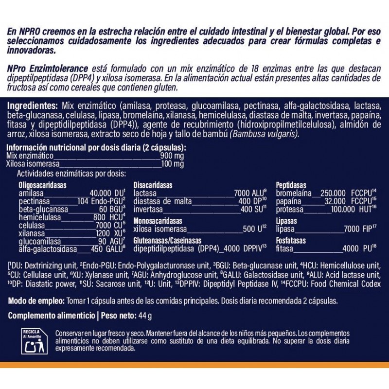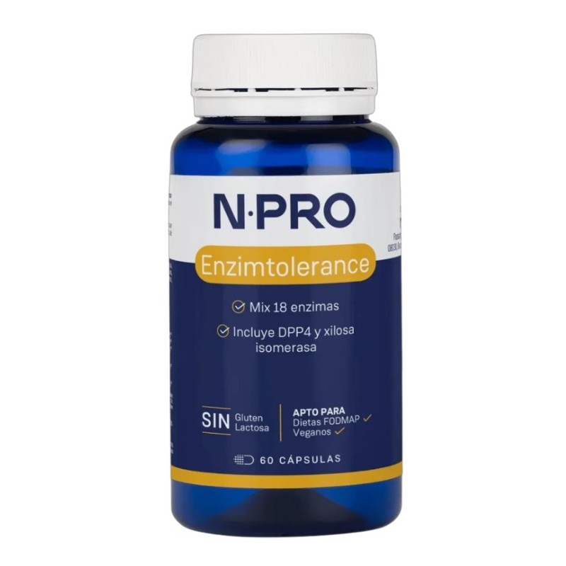 NPRO Enzimtolerance Cápsulas contiene un mix de 18 enzimas digestivas que ayudan a mejorar la digestión de proteínas, carbohidratos, grasas y fibras. Su fórmula avanzada con DPP4 y xilosa isomerasa reduce hinchazón, gases y malestar digestivo, favoreciendo el bienestar intestinal y la absorción de nutrientes.