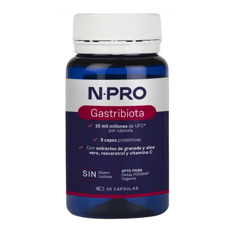 NPRO Gastribiota Cápsulas es un innovador complemento alimenticio formulado con una exclusiva combinación de 9 cepas bacterianas, resveratrol, vitamina C y extractos naturales de granada y aloe vera. Su objetivo es mantener el equilibrio de la microbiota gástrica y favorecer la salud digestiva, especialmente en aquellas personas que sufren molestias estomacales, acidez o digestiones pesadas.
