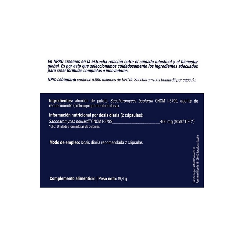 NPRO Leboulardi Cápsulas contiene 5.000 millones de UFC de Saccharomyces boulardii CNCM I-3799 por cápsula, ayudando a restaurar y proteger la microbiota intestinal, mejorar la digestión y favorecer una respuesta inmunitaria equilibrada. Ideal para proteger la flora intestinal frente a antibióticos y desequilibrios digestivos.