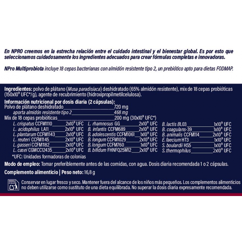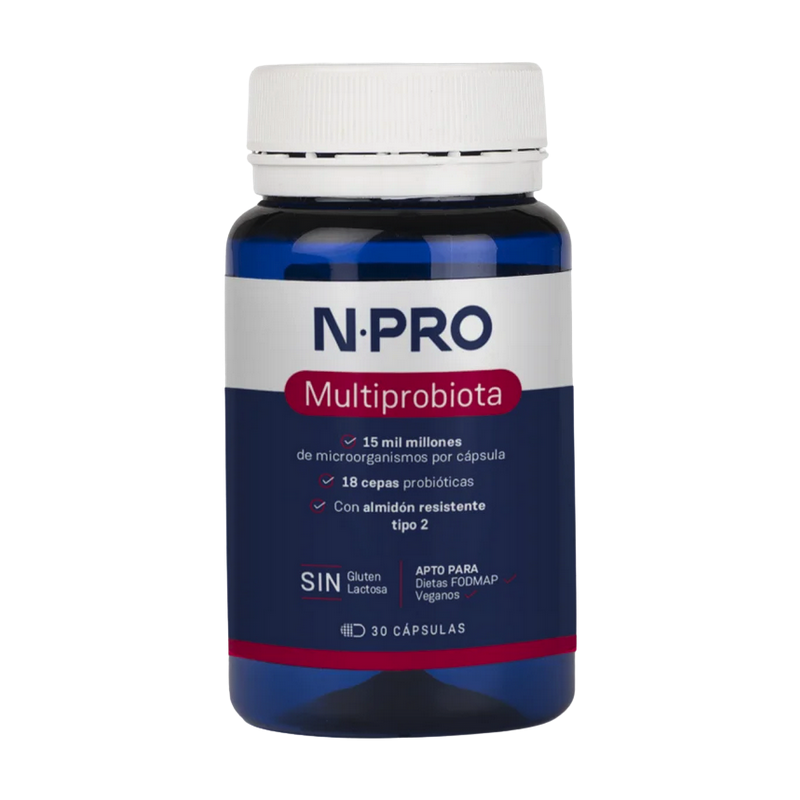 A diferencia de otros productos del mercado, NPRO Multiprobiota está libre de fibras prebióticas susceptibles de causar intolerancias o disconfort intestinal, por lo que resulta adecuado incluso para personas con intestinos sensibles o que presentan síndrome de intestino irritable. Esta fórmula contribuye a restablecer la flora intestinal, mejorar la digestión, reforzar el sistema inmunitario y promover una salud intestinal óptima.