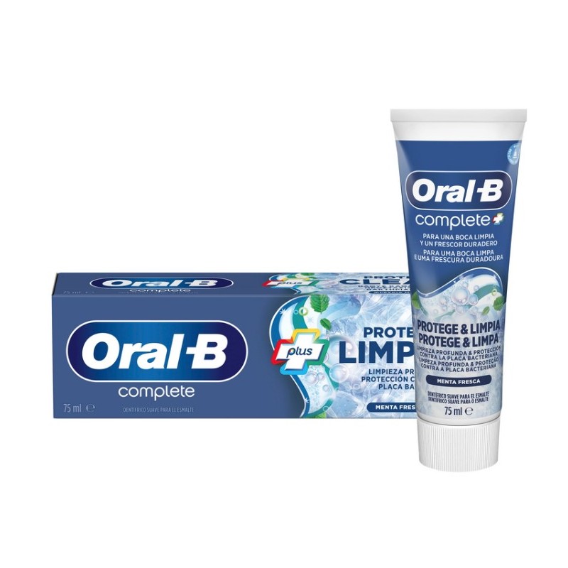 Oral-B Complete Protege y Limpia es una pasta dentífrica diseñada para una limpieza profunda y protección completa de la boca. Este producto no solo elimina eficazmente la placa bacteriana, sino que también proporciona un frescor instantáneo a menta fresca y duradero y ayuda a blanquear los dientes eliminando las manchas superficiales.