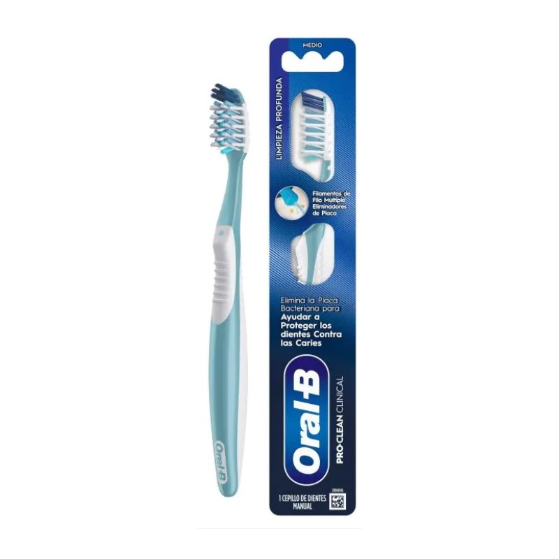 Oral-B Pro-Clean Clinical Cepillo de Dientes Manual es un cepillo dental manual de limpieza profunda diseñado para ofrecer una higiene bucal completa y eficaz desde todos los ángulos. Gracias a su innovador diseño con filamentos multisuperficie, puntas PowerTip y limpiador de lengua integrado, ayuda a eliminar eficazmente la placa bacteriana, incluso en las zonas de difícil acceso como la parte posterior de los molares.