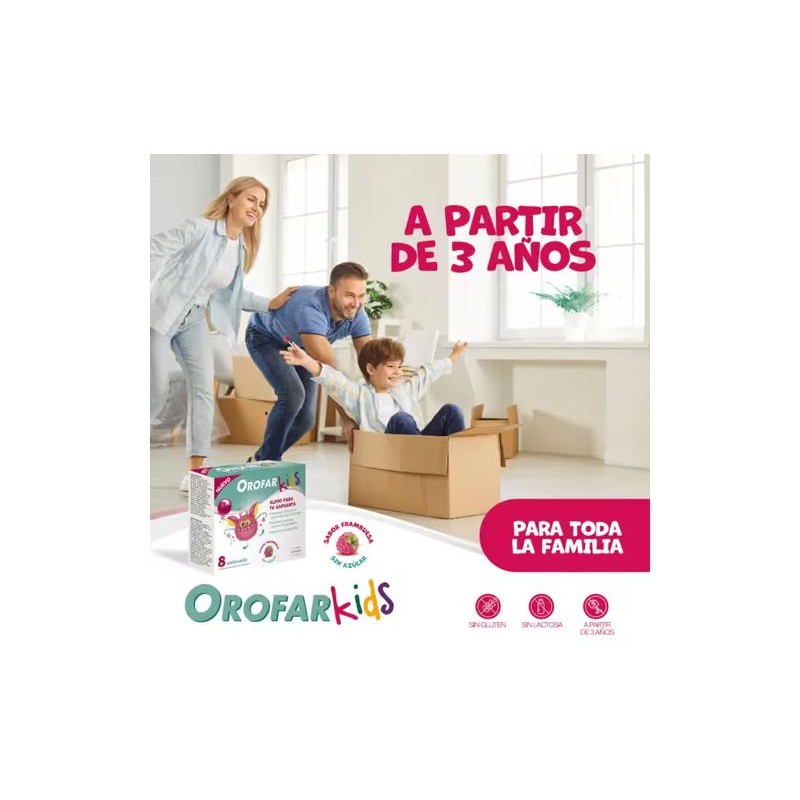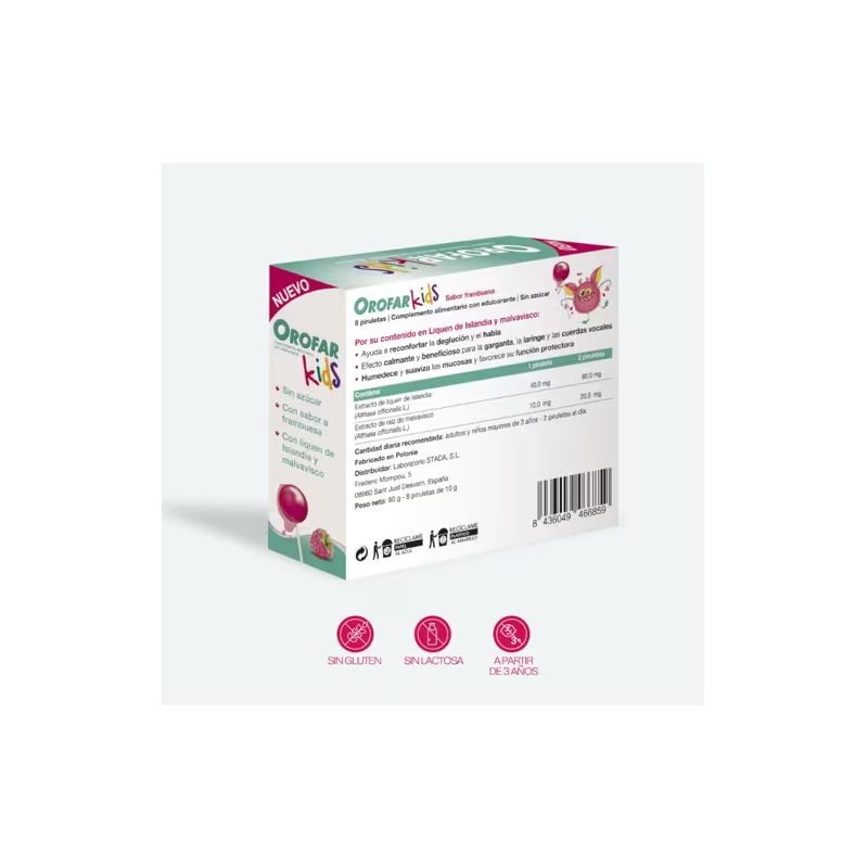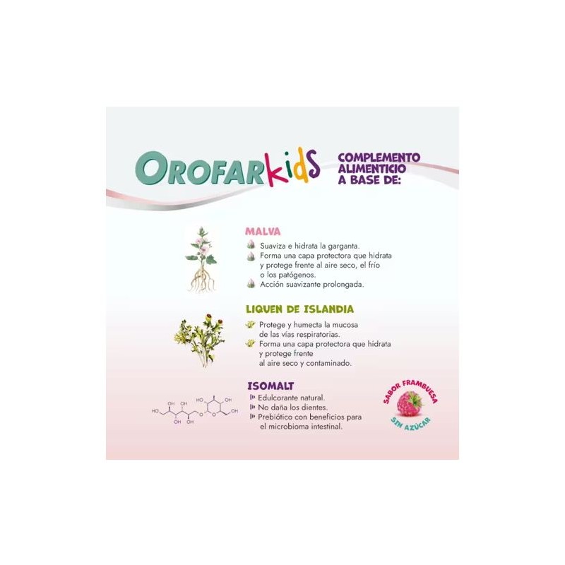 OROFAR Kids Piruletas Alivio Garganta +3 Años son piruletas sin azúcar con delicioso sabor a frambuesa que ayudan a aliviar el picor y las molestias de garganta en niños. Formuladas con líquen islandés y malvavisco, crean una película protectora y aportan alivio rápido desde los 3 años.