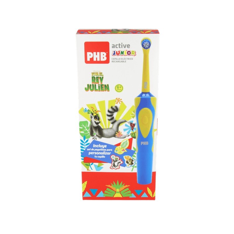 PHB Cepillo Eléctrico Active Junior ofrece una limpieza eficaz con su cabezal rotacional de 6.000 rpm y filamentos suaves Tynex. Ideal para niños desde los 6 años, elimina la placa bacteriana y promueve una higiene bucal divertida con pegatinas personalizables.
