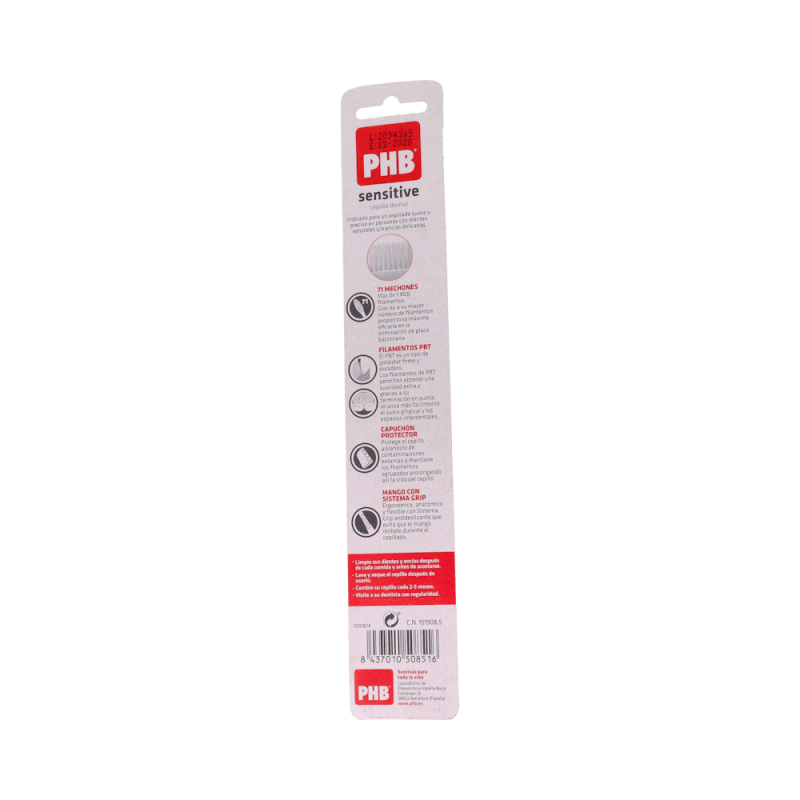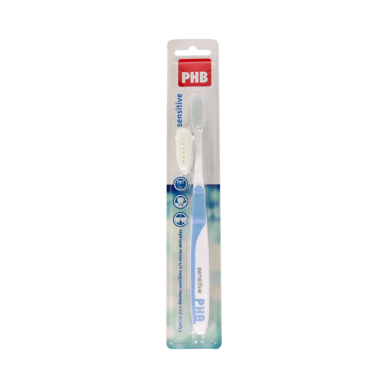 PHB Sensitive Cepillo Dental es un cepillo de tamaño medio, diseñado especialmente para quienes buscan una limpieza dental profunda y cuidadosa en dientes y encías sensibles. Este cepillo cuenta con un cabezal ovalado y fibras de poliéster, que ofrecen una limpieza eficaz al adaptarse al movimiento manual del cepillado, permitiendo un mayor arrastre de bacterias sin dañar el tejido gingival.