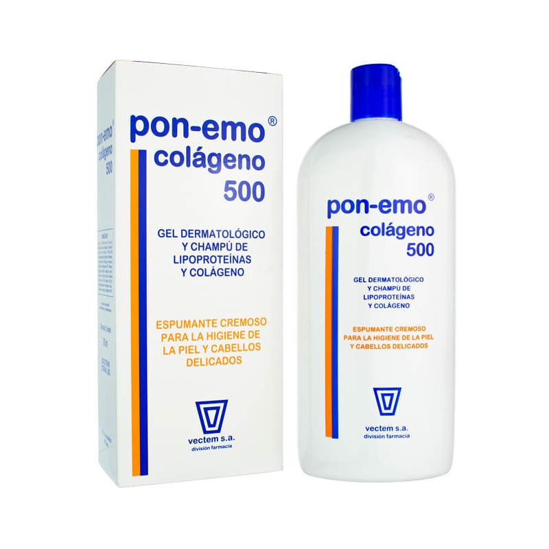 Pon-Emo Colágeno es un gel-champú de uso dermatológico especialmente creado para la higiene suave de pieles delicadas y cabellos secos o frágiles. Su fórmula combina lipoproteínas con colágeno hidrolizado para limpiar, hidratar y reforzar la barrera natural de la piel, al tiempo que fortalece la fibra capilar.