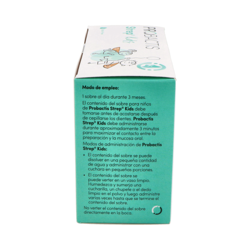 El contenido del sobre para niños de Probactis Strep Kids debe tomarse antes de acostarse después de cepillarse los dientes. Probactis Strep Kids debe administrarse al niño durante aproximadamente 3 minutos para maximizar el contacto entre la preparación y la mucosa oral del niño.