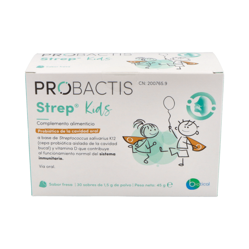 Probactis Strep Kids es un complemento alimenticio formulado especialmente para niños, diseñado para fortalecer las defensas naturales del oído, garganta y boca.