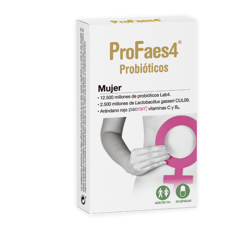 ProFaes4 Probióticos Mujer es un complemento alimenticio formulado específicamente para el bienestar íntimo femenino. Su composición única incluye el consorcio probiótico Lab4, el Lactobacillus gasseri CUL-09 —común en la microbiota vaginal saludable—, extracto de Arándano Rojo pacran® y las vitaminas B6 y C, que contribuyen al correcto funcionamiento del sistema inmunitario y al mantenimiento del equilibrio fisiológico de la mujer.