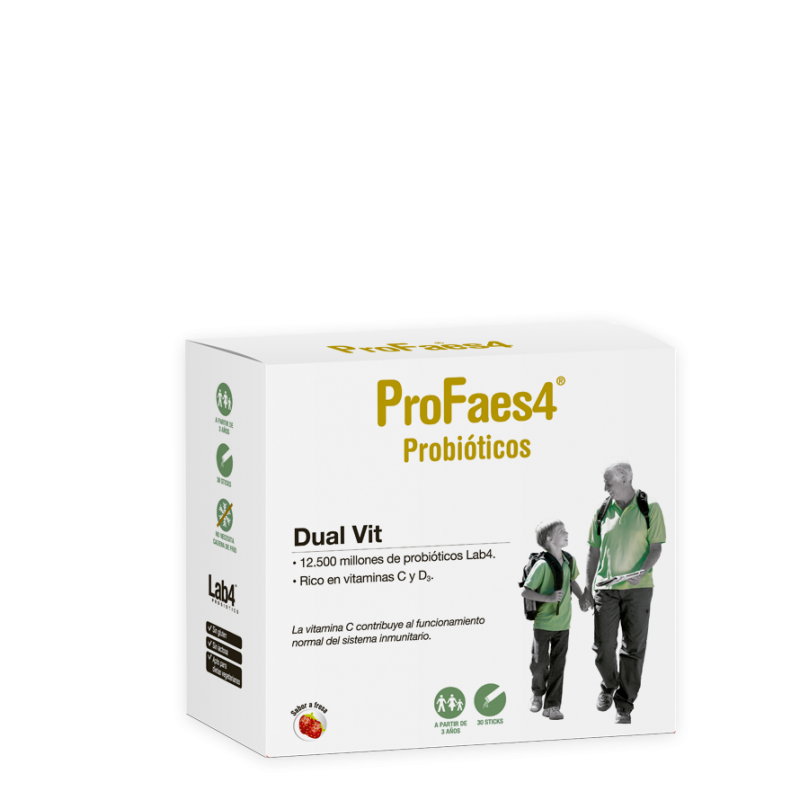 Se presenta en cómodos sticks monodosis y está diseñado para proporcionar un aporte eficaz de bacterias activas junto a fibra prebiótica, además de nutrientes esenciales para la inmunidad. Cada stick de ProFaes4 Probióticos Dual-VitM contiene 12,5 mil millones de bacterias activas, 1.000 mg de FOS, y dosis adecuadas de vitamina C y vitamina D3, actuando en sinergia para mejorar la salud digestiva e inmunológica.