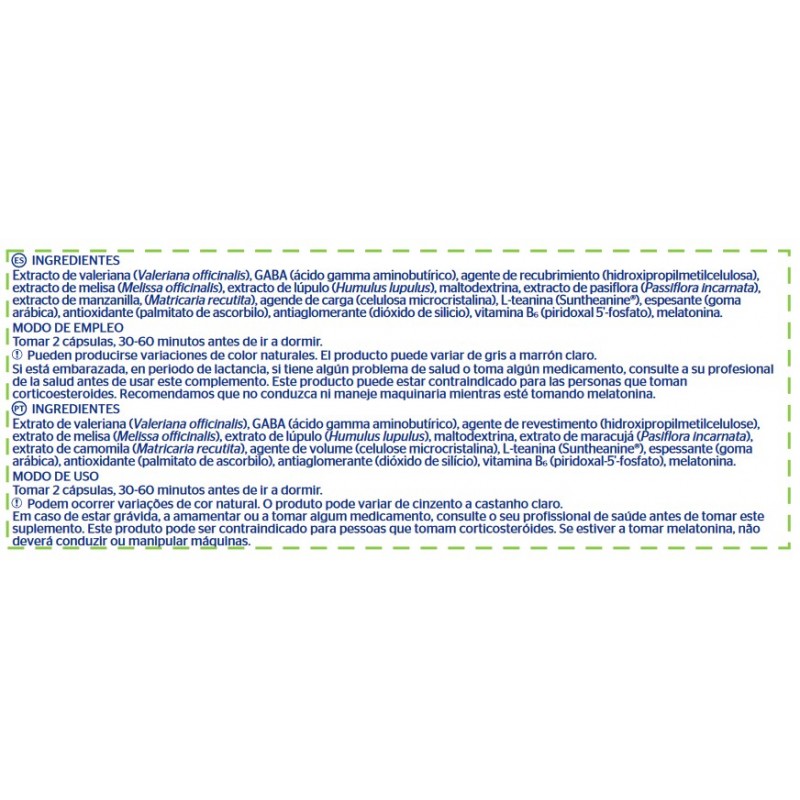 - Extracto de melisa, lúpulo, pasiflora y manzanilla: Plantas tradicionalmente usadas para calmar la mente y el cuerpo.