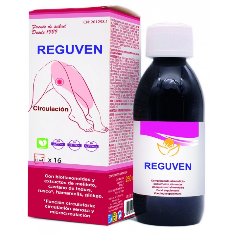 Reguven Jarabe es un complemento alimenticio en formato jarabe, elaborado con una fórmula única que combina extractos estandarizados de plantas medicinales, vitaminas del grupo B y C, y compuestos con acción antioxidante. Este producto ha sido desarrollado específicamente para ayudar a mejorar la circulación venosa y aliviar la molesta sensación de piernas pesadas. Su presentación líquida facilita la absorción rápida de sus principios activos, garantizando una acción eficaz desde la primera toma.