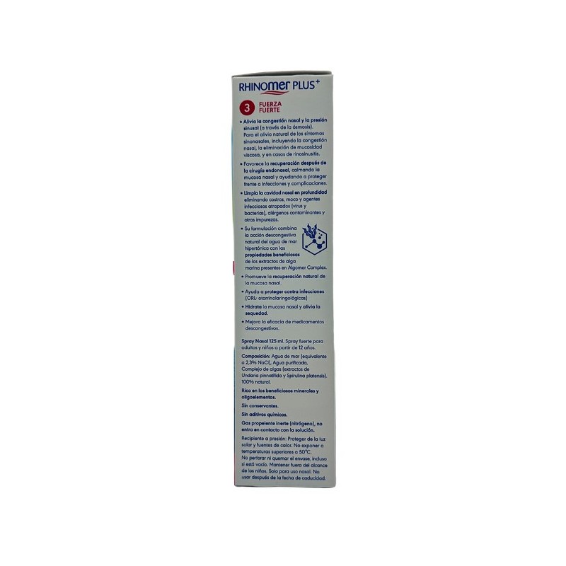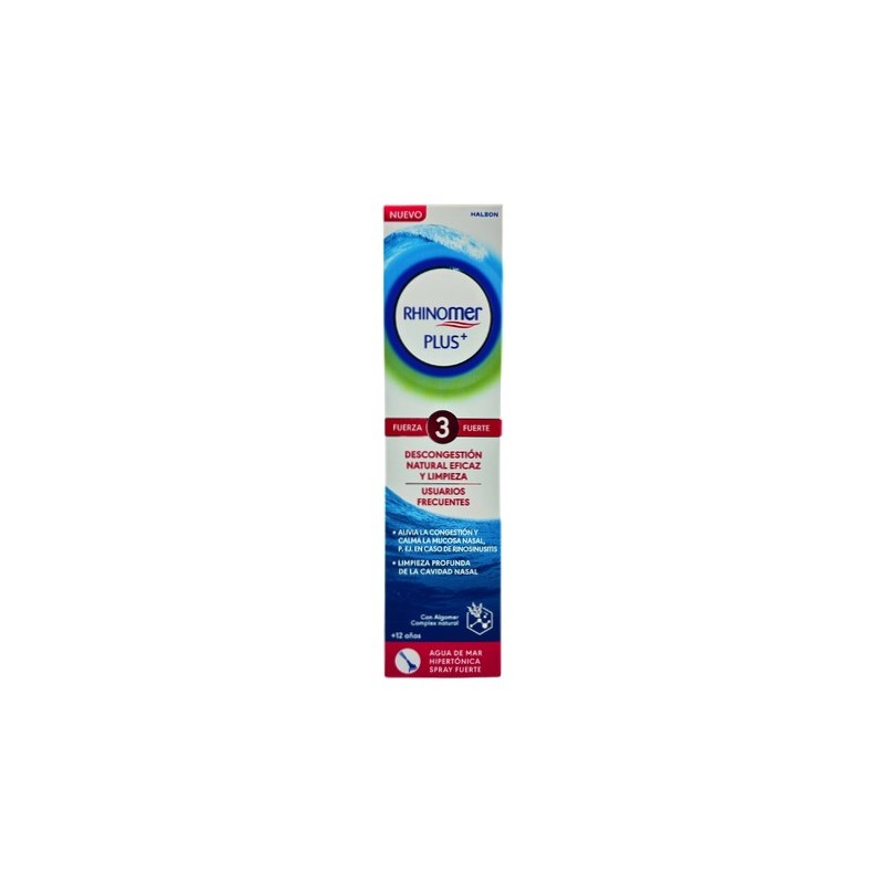 Rhinomer Plus+ 3 Fuerza Fuerte es una solución de agua de mar natural diseñada especialmente para la limpieza nasal y la descongestión de las fosas nasales en adultos y niños a partir de 12 años. Este producto es ideal para usuarios frecuentes que buscan mantener una adecuada higiene nasal diaria y mejorar su calidad de vida respiratoria.
