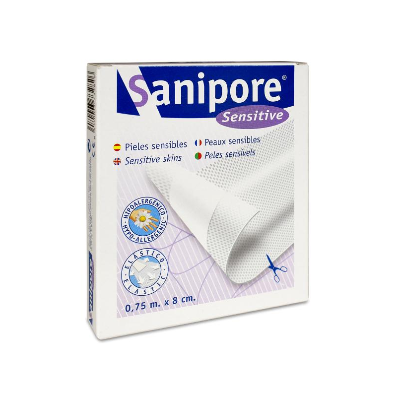 Sanipore Apósito Adhesivo 75X8 CM está fabricado con materiales hipoalergénicos y libres de látex, lo que lo hace adecuado para personas con pieles sensibles o alergias. Está compuesto por: