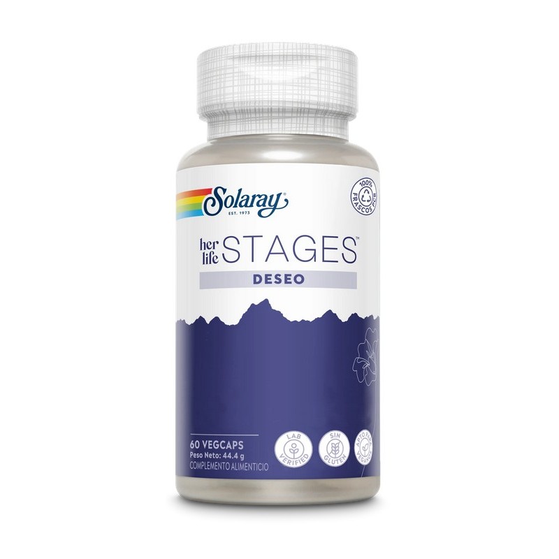 Solaray Stages Deseo es un complemento alimenticio natural con extractos de plantas y L-arginina que ayuda a estimular el deseo sexual, la vitalidad y el bienestar íntimo de forma natural.