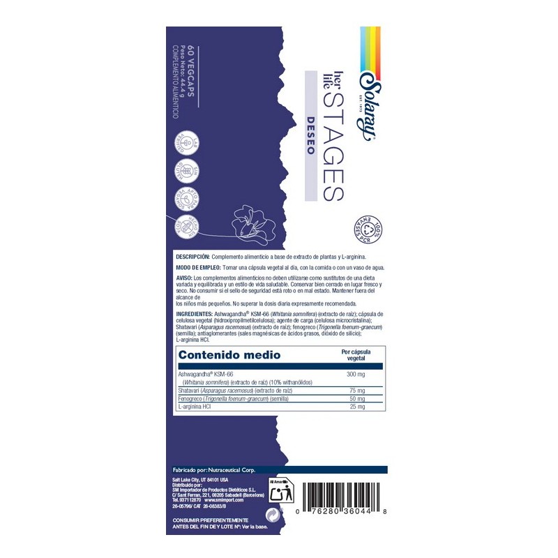 Este producto forma parte de la línea Solaray Stages, creada para acompañar diferentes etapas y necesidades del organismo mediante fórmulas específicas, eficaces y basadas en ingredientes de alta calidad. Solaray Stages Deseo combina adaptógenos tradicionales y nutrientes funcionales que ayudan a mantener el equilibrio físico y emocional relacionado con la libido.
