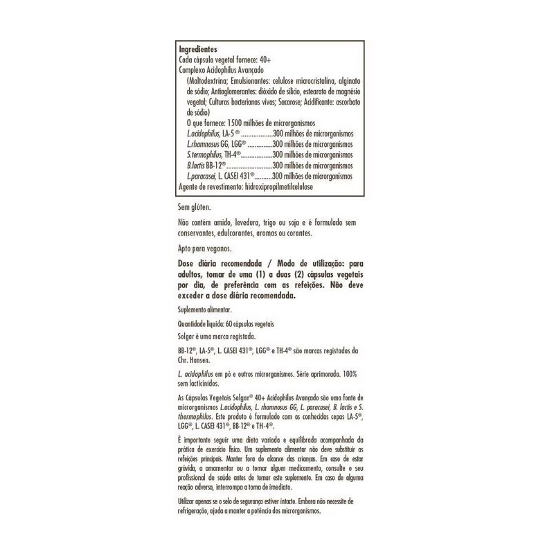 40+ Acidophilus Avanzado Complex (que aporta L. acidophilus, LA-5®, L. rhamnosus GG, LGG®, S. termophilus, TH-4®, B. lactis, BB-12®, L. paracasei, L. CASEI 431®). Agentes de carga: maltodextrina, celulosa microcristalina, alginato sódico; cultivos probióticos; antiaglomerantes: dióxido de silicio, estearato de magnesio vegetal. Cápsula vegetal: hidroxipropilmetilcelulosa; Agente de carga: celulosa microcristalina; Antiaglomerante: estearato magnésico vegetal.