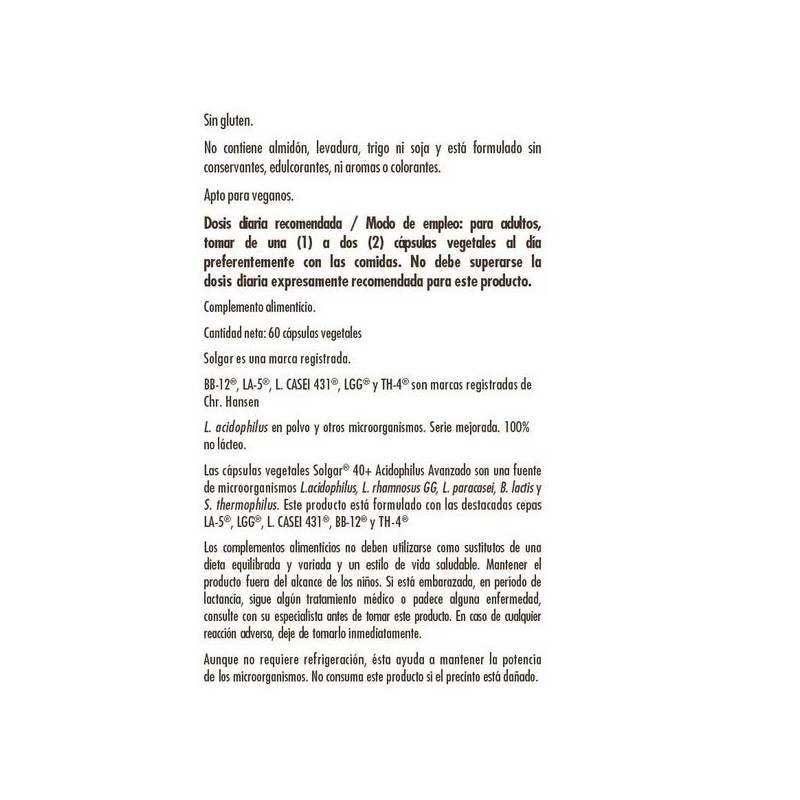 Solgar 40+ Acidophilus Avanzado es una formulación no láctea, que aporta las cepas especialmente cultivadas LA-5®, BB-12®, L.CASEI 431®, LGG® y TH-4®. Este complejo de 40+ acidophilus aporta 1.500 millones de microorganismos, 300 millones de cada una de las cepas.