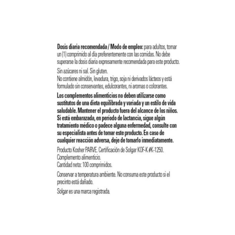 No contiene azúcar, sal, gluten, almidón, trigo, derivados lácteos, soja, levadura, conservadores, edulcorantes ni aromas artificiales, lo que lo convierte en un suplemento adecuado para personas con diversas restricciones alimentarias.