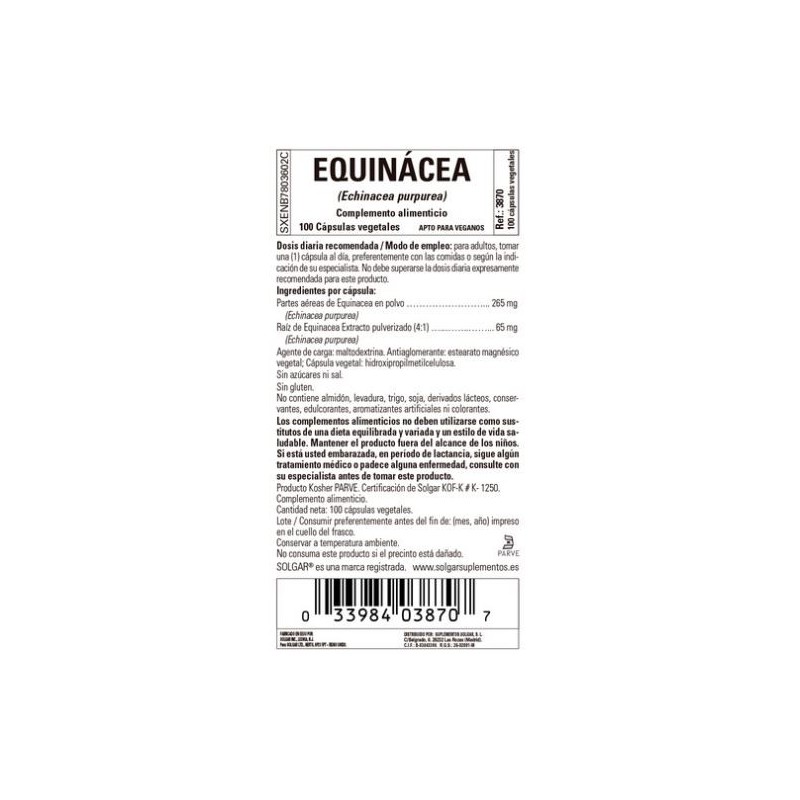 Solgar Equinácea es un suplemento a base de Equinácea (Echinacea purpurea), que contribuye a un normal sistema inmune.