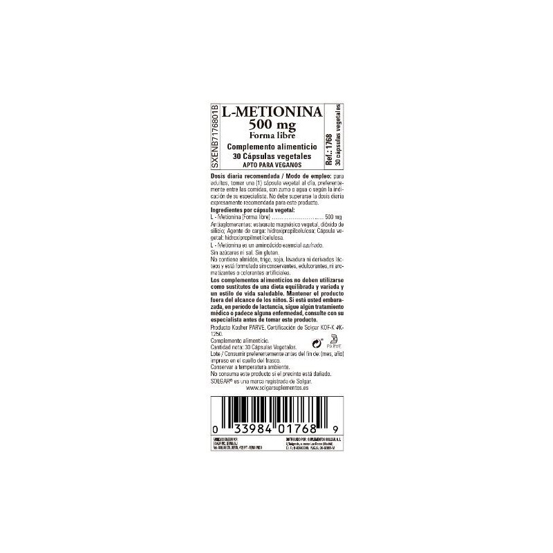 Solgar® L-Metionina Cápsulas vegetales de 500 mg es uno de los productos de la gama de aminoácidos de Solgar de más alta calidad. Contiene L-metionina, un aminoácido que contiene azufre.