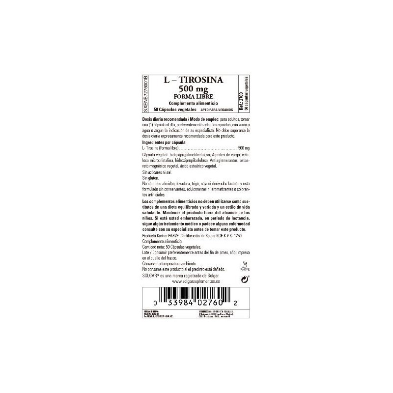 Solgar® L-Tirosina 500 mg Cápsulas vegetales se presenta en una dosis de 1 cápsula al día en una formulación vegetal de fácil absorción.