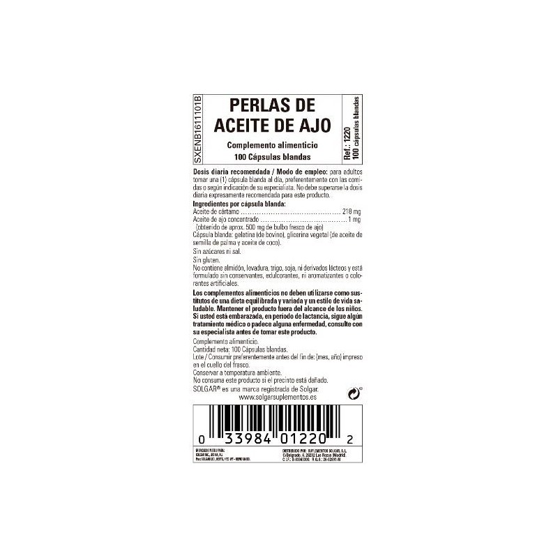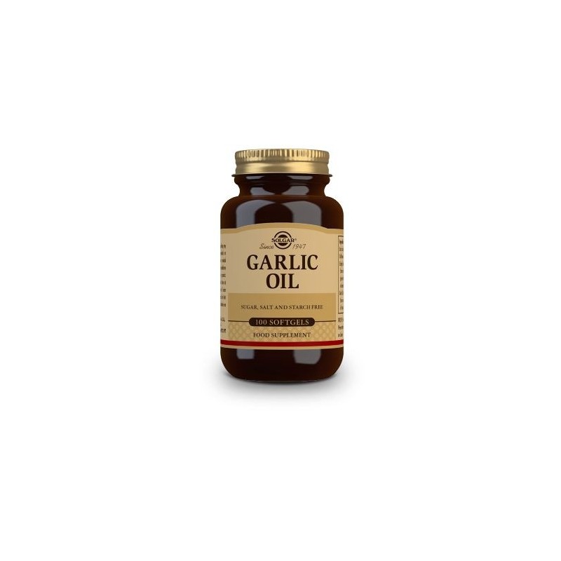Solgar Perlas de Aceite de Ajo en Cápsulas blandas contiene concentrado de aceite de ajo equivalente a 500 mg de diente de ajo fresco.