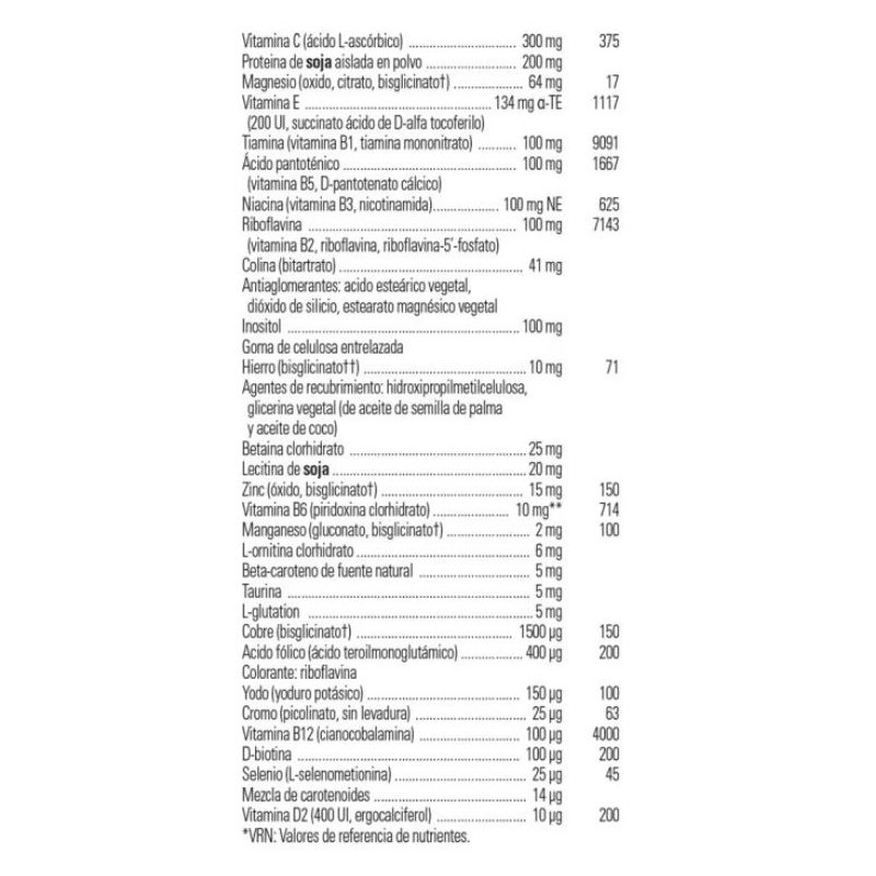 Vitamina C (ascorbato cálcico), Base nutriente herbaria en polvo [Alfalfa (Medicago sativa) hoja y tallo; Escaramujo (Rosa canina) fruto; complejo de bioflavonoides cítricos; Rutina; fibra de Avena; Ginseng Siberiano (Eleutherococcus senticosus) raíz; Dong Quai (Angelica sinensis) raíz; Echinacea purpurea raíz; Espirulina; Suma (Pfaffia paniculata) raíz en polvo; Berro (Nasturtium officinale) hoja; Perejil (Petroselinum crispum) hoja y tallo; Hesperidina Complex; Goma Guar (Cyamopsis tetragonoloba) semilla], Proteina de soja aislada en polvo, Vitamina E (200 U.I., succinato ácido de D-alfa tocoferilo), Tiamina (Vitamina B1, tiamina mononitrato), Vitamina B6 (piridoxina clorhidrato), Ácido pantoténico (Vitamina B5, D-pantotenato cálcico), Riboflavina (Vitamina B2), Niacina (Vitamina B3, nicotinamida), Inositol, Calcio (ascorbato, bisglicinato, carbonato), Colina (bitartrato), Magnesio (bisglicinato, oxido), Betaina clorhidrato, Lecitina de Soja, Zinc (oxido, bisglicinato), Hierro (bisglicinato), L-Ornitina clorhidrato, Beta-caroteno de fuente natural, L-glutatión, Taurina, Manganeso (gluconato, bisglicinato), Boro (ácido bórico), Cobre (gluconato, bisglicinato), Ácido Fólico (ácido teroilmonoglutámico), Yodo (Yoduro potásico), Vitamina B12 (cianocobalamina), D-biotina, Selenio (L-selenometionina), Cromo (picolinato, sin levadura), Mezcla de carotenoides, Vitamina D2 (400 U.I.). Antiaglomerantes: estearato magnésico vegetal, acido esteárico vegetal, dióxido de silicio; Agentes de recubrimiento: hidroxipropilmetilcelulosa, glicerina vegetal (de aceite de semilla de palma y aceite de coco); Agentes de carga: celulosa microcristalina, alginato, almidón de guisante, hidroxipropilmetilcelulosa, fosfato dicálcico, manitol, ácido cítrico; Goma de celulosa; Colorante: riboflavina.