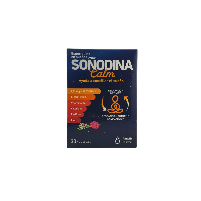 Soñodina Calm es un producto diseñado para proporcionar alivio natural y efectivo contra los trastornos del sueño y el estrés. Con melatonina, vitamina B6, L-triptófano, extractos de valeriana y pasiflora y zinc, para contribuir a un sueño saludable.
