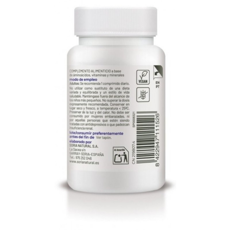 SORIA Natural Bienestar Emocional ayuda a mantener el equilibrio del sistema nervioso, la función mental normal y el desempeño cognitivo. Con vitaminas y minerales en comprimidos de liberación sostenida, vegano y sin gluten.