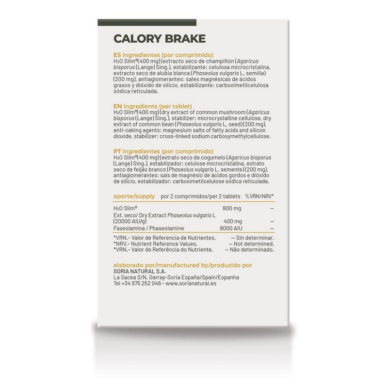 SORIA Natural Calory Brake está elaborado a partir de H2O Slim® y extracto seco de alubia blanca (Phaseolus vulgaris L. semilla), conocidos por su capacidad para interferir en la digestión de carbohidratos complejos y grasas. Gracias a esta combinación, el producto se convierte en un aliado práctico para quienes desean cuidar su alimentación sin renunciar ocasionalmente a comidas más abundantes.