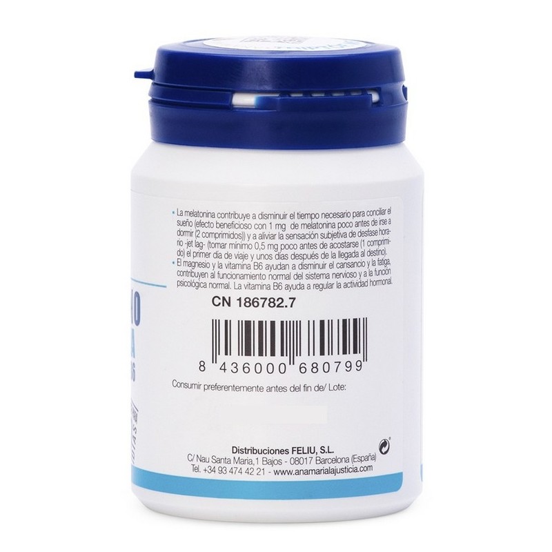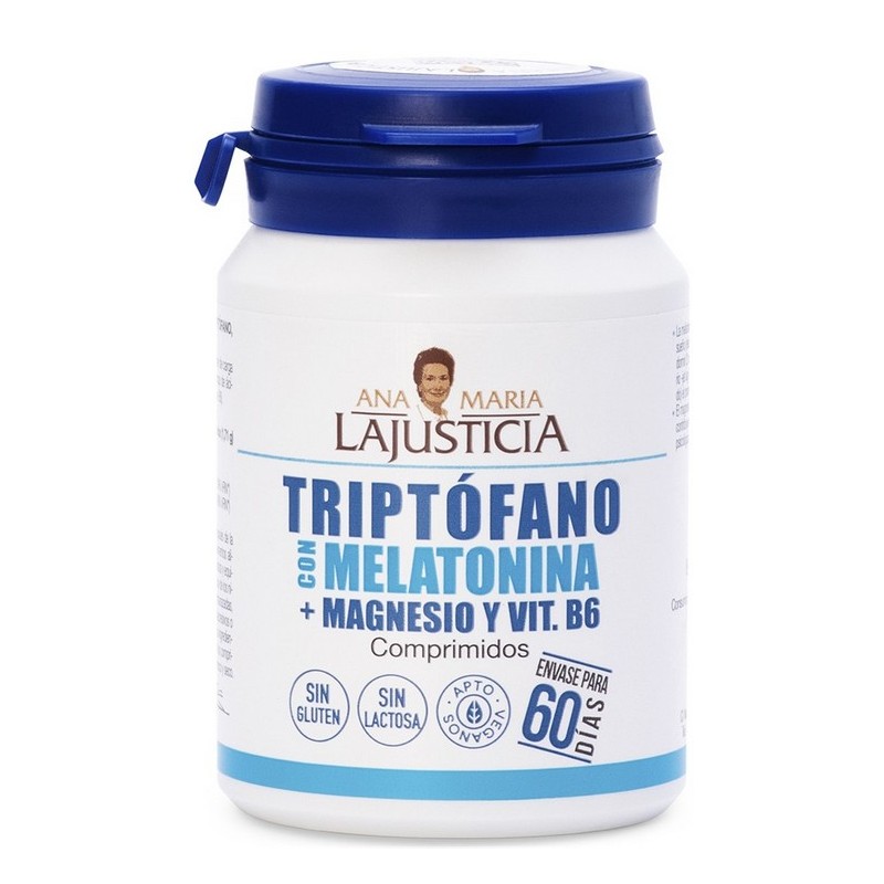 ANA MARIA LAJUSTICIA Triptófano con Melatonina + Magnesio y Vit. B6 es un suplemento eficaz y seguro para aquellas personas que buscan una solución natural para dormir mejor y afrontar el día con más energía. Gracias a su fórmula completa, actúa tanto a nivel neurológico como muscular, siendo una ayuda ideal en situaciones de estrés, cansancio o insomnio ocasional. Un aliado esencial en tu rutina de bienestar.