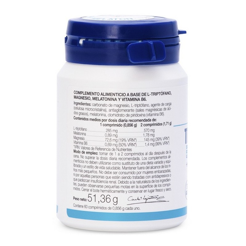 ANA MARIA LAJUSTICIA Triptófano con Melatonina + Magnesio y Vit. B6 es un complemento alimenticio formulado para favorecer el descanso nocturno y mejorar la calidad del sueño de forma natural. Esta combinación única integra ingredientes esenciales como el L-triptófano, melatonina, magnesio y vitamina B6, que actúan en sinergia para regular los ritmos circadianos, reducir el estrés y fomentar la relajación muscular. Su formato en comprimidos facilita la dosificación adecuada y está diseñado para personas con dificultades para dormir o que desean mejorar su descanso.