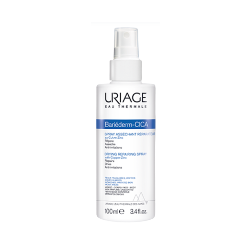Uriage Bariéderm-CICA Spray Secante Reparador con Cu-Zn es un spray secante y reparador ideal para zonas húmedas, irritadas o con exudación. Alivia, sanea y absorbe el exceso de humedad gracias al cobre, zinc, esmectita y el Agua Termal de Uriage. Aplicación higiénica, alta tolerancia y secado rápido.