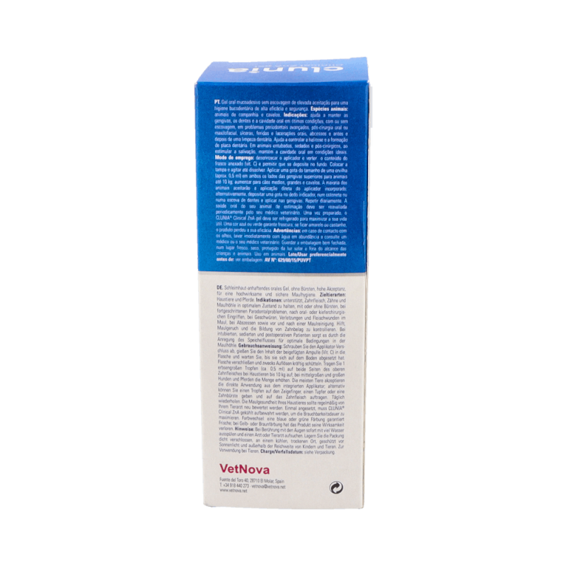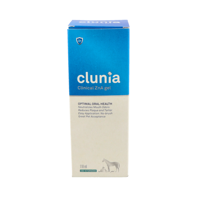 VetNOVA CLUNIA Clinical Zn-A Gel es un gel oral mucoadhesivo especialmente formulado para la higiene buco-dental de perros, gatos, caballos y otros animales. Su fórmula avanzada potenciada con ácido ascórbico (vitamina C) y zinc ofrece una solución segura y eficaz para mantener la salud oral óptima, prevenir la placa dental y controlar la halitosis sin necesidad de cepillado.
