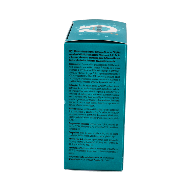 VetNova CONECTA Cápsulas es un suplemento alimenticio especialmente formulado para perros y gatos, que aporta una combinación equilibrada de ácidos grasos Omega-3 (DHA/EPA) altamente biodisponibles junto con vitaminas del complejo B (B1, B2, B6, B12), vitamina A y D3. Este complemento contribuye al correcto funcionamiento y soporte del sistema nervioso central y periférico, la salud visual y el bienestar del aparato locomotor.