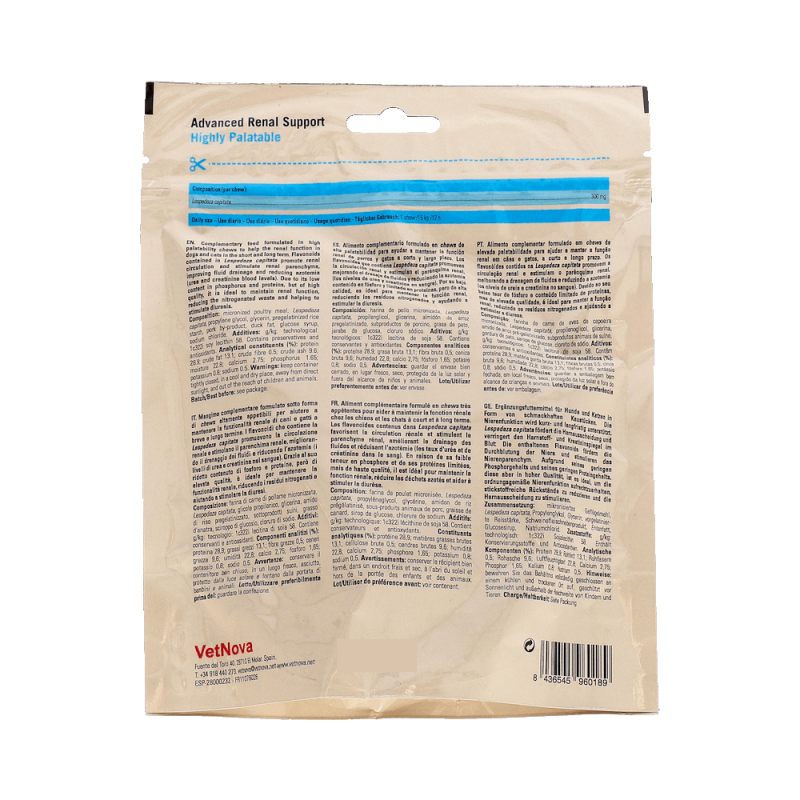 VetNova DIALIX Lespedeza 15 es un suplemento formulado en chews de alta palatabilidad para perros y gatos, especialmente diseñado para apoyar el mantenimiento de la función renal. Este alimento complementario está enriquecido con extracto de Lespedeza capitata, una planta rica en flavonoides que contribuyen a preservar la salud renal y favorecer el correcto funcionamiento del sistema urinario. Su fórmula cuenta con un bajo contenido en fósforo, lo que la hace ideal para animales con necesidades específicas de control en este mineral.