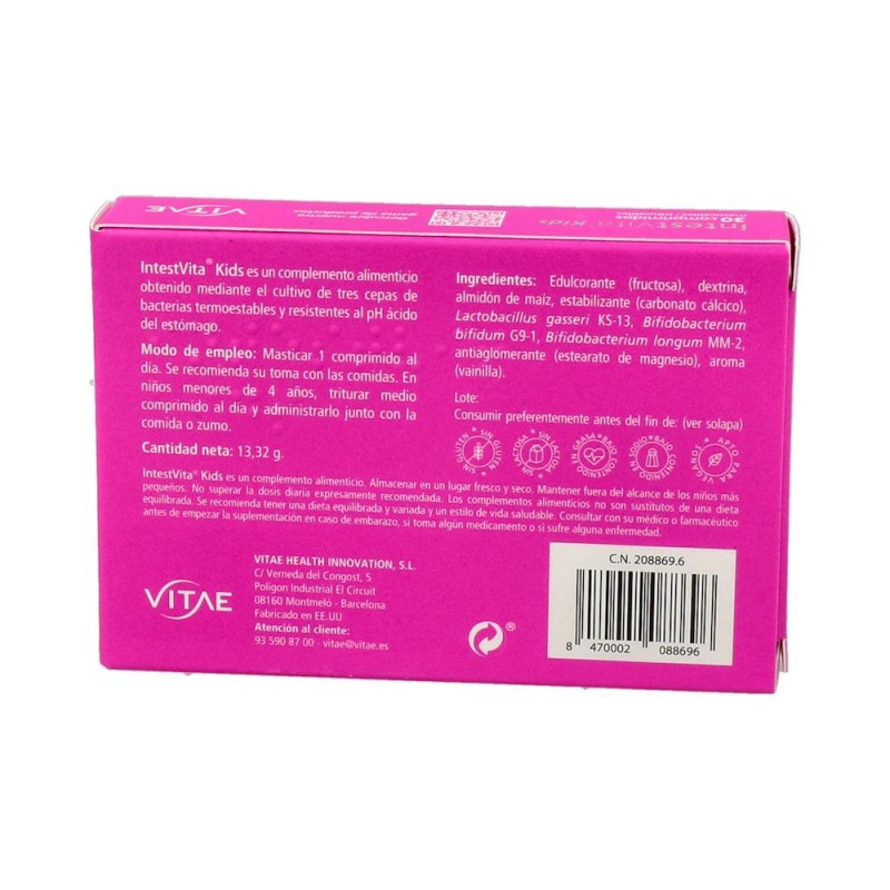 Vitae IntestVita Kids es una solución eficaz y segura para cuidar la microbiota intestinal infantil. Gracias a su exclusiva mezcla de probióticos, ayuda a prevenir y aliviar trastornos digestivos, favorece el desarrollo del sistema inmune y mejora la calidad de vida de los más pequeños. Su formato masticable y sabor agradable lo convierten en un aliado perfecto para padres que buscan lo mejor para la salud digestiva de sus hijos.