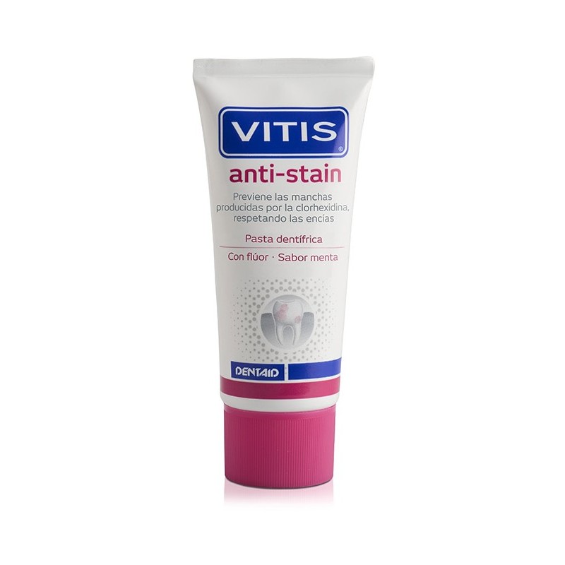 Vitis Antimanchas Pasta Dental es una pasta dentífrica con flúor desarrollada para el cuidado diario durante los tratamientos que incluyen clorhexidina.
