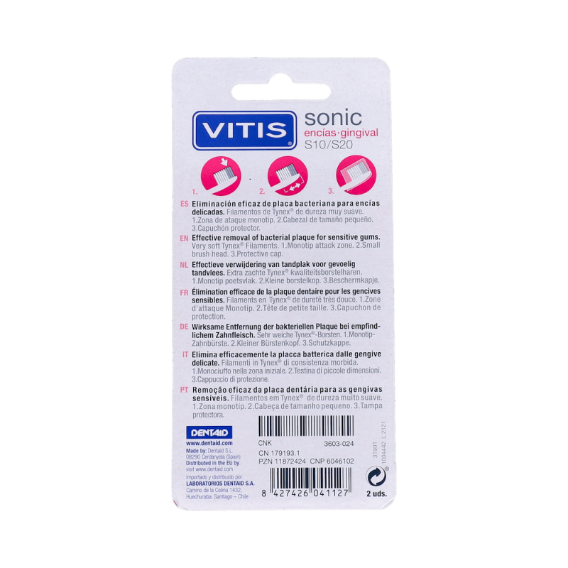 Es importante utilizar el VITIS CABEZAL SONIC ENCIAS S10/S20 según las instrucciones para evitar daños en las encías. No debe aplicarse una presión excesiva al cepillarse, y se recomienda no usar el cabezal si se encuentra desgastado. Mantener fuera del alcance de los niños y reemplazar cada tres meses o antes si los filamentos están dañados.