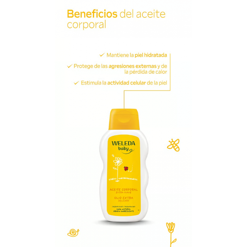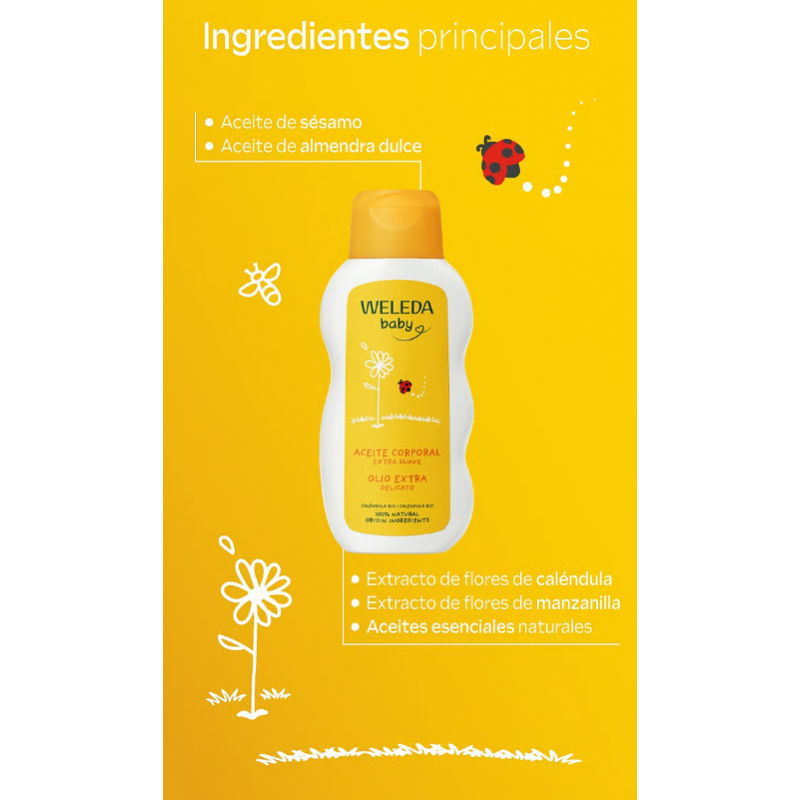 Weleda Aceite de Caléndula es un aceite de bebé 100% natural que cuida y protege la piel delicada del bebé. Ideal para hidratación después del baño y masajes relajantes, combina almendra dulce, caléndula y manzanilla BIO para mantener la piel suave, protegida y confortable. Producto certificado Natrue, vegan y gluten free.
