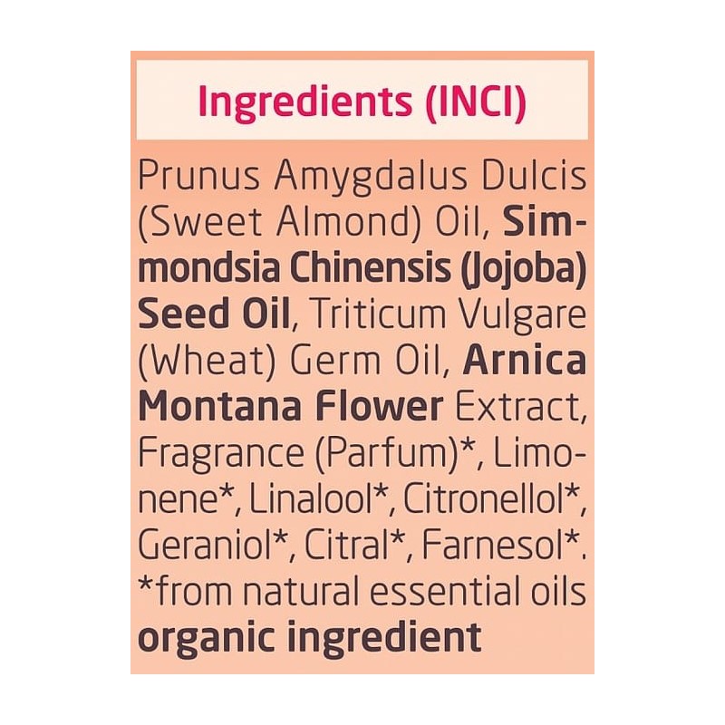 Weleda Duplo Aceite de Masaje para Estrías contiene una selección de aceites vegetales y extractos naturales orientados a nutrir y flexibilizar la piel. Entre sus componentes destacables suelen encontrarse aceites vegetales emolientes (como aceite de almendra dulce, aceite de jojoba o aceite de germen de trigo) y extractos botánicos que favorecen la regeneración y elasticidad cutánea. La fórmula es libre de ingredientes agresivos y se presenta como producto natural adecuado para pieles sensibles.