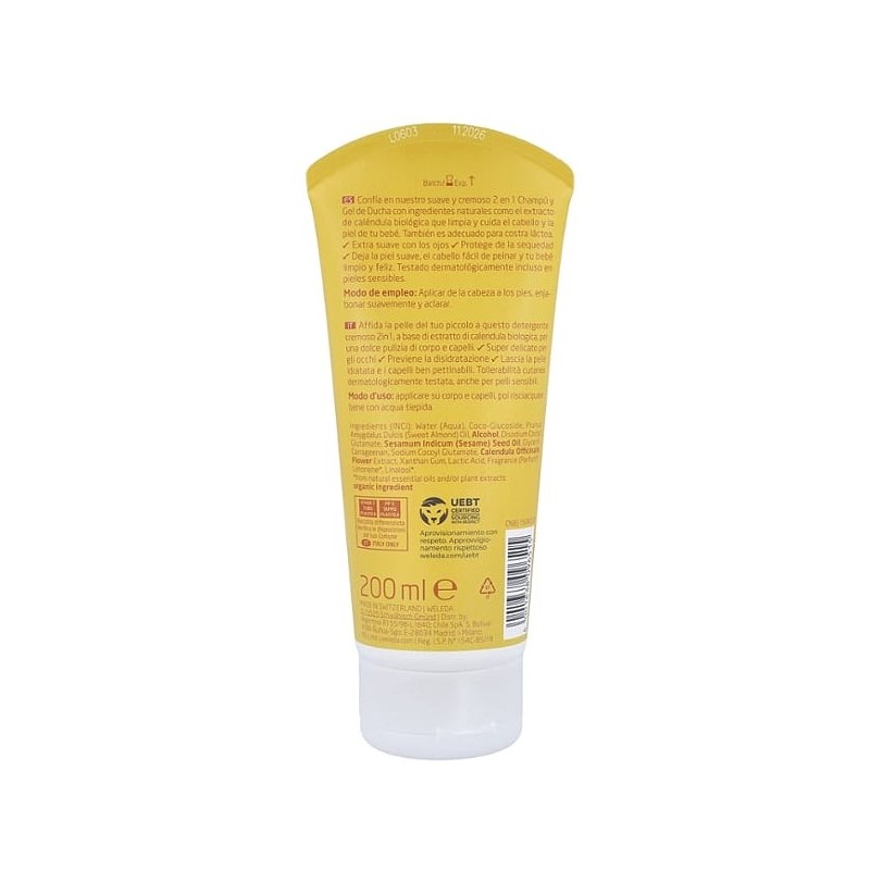 Weleda Champú y Gel de Ducha de Caléndula es un cuidado 2 en 1 sin jabón que limpia suavemente la piel y el cabello del bebé. Con caléndula BIO, aceite de almendra y aceite de sésamo, hidrata, protege y evita la sequedad, dejando el cabello suave y fácil de peinar. Ideal para pieles sensibles y uso diario.